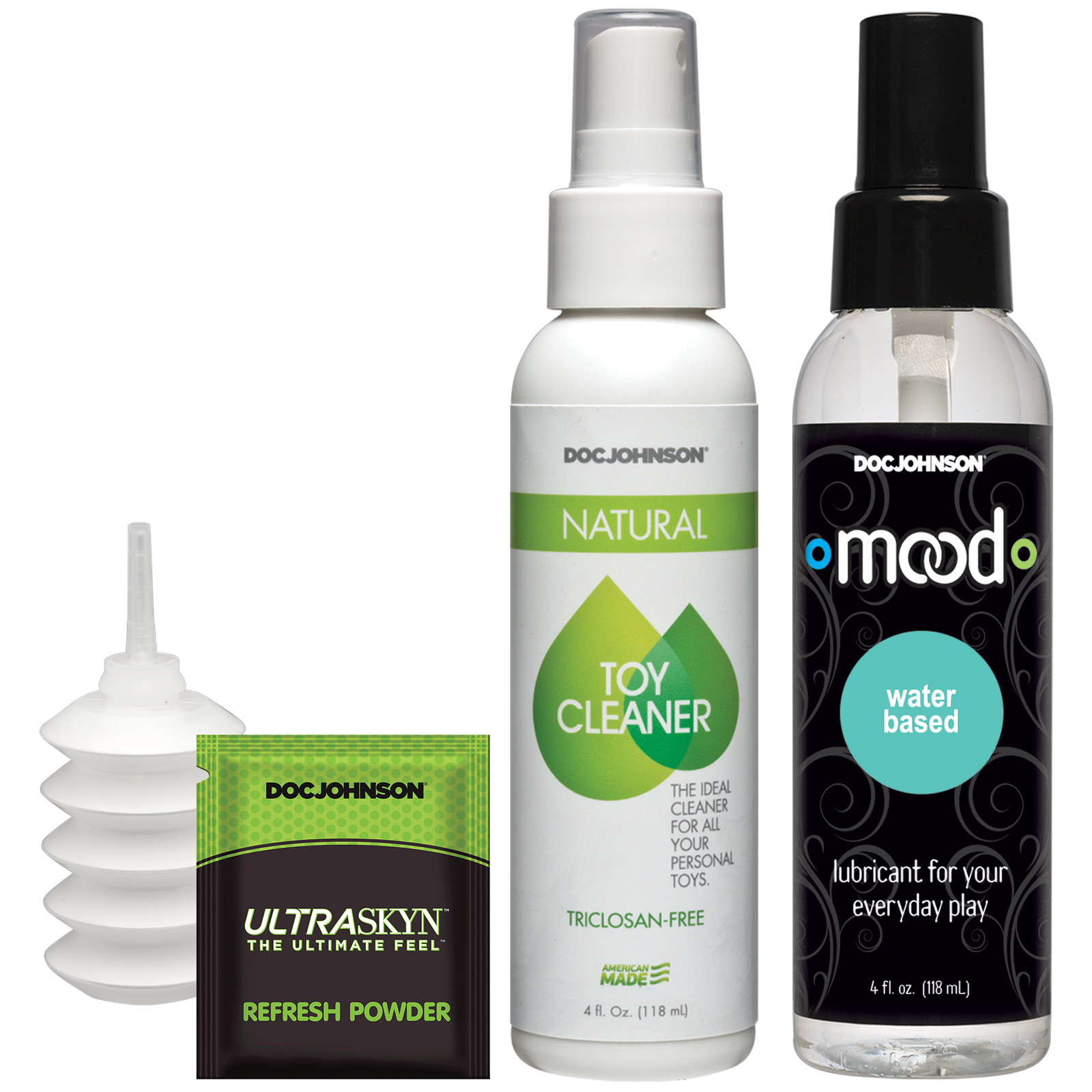 У комплект входять: лубрикант на водній основі (118 мл), очищуючий засіб для іграшок (118 мл) та пудра для зберігання (5 г). Всі матеріали безпечні і не містять фталатів.