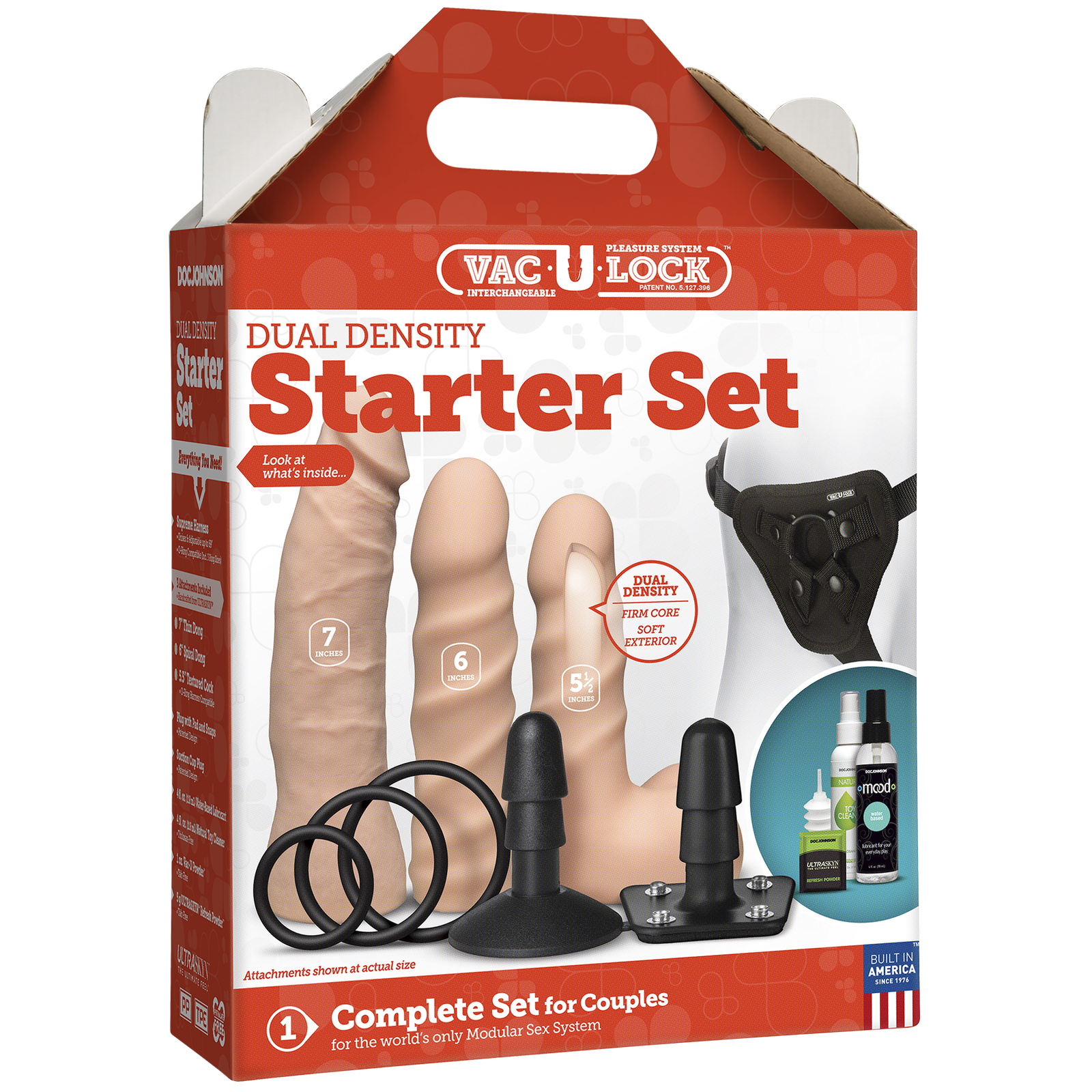 Пропонуємо вам незабутнє знайомство з набором страпона Doc Johnson Vac-U-Lock – Dual Density Starter Set. Це ідеальний комплект для тих, хто тільки починає свою подорож у світ інтимних ігор. У наборі ви знайдете три фалоімітатори різних розмірів, два кріплення на присосці, регульовані трусики та три змінних кільця. Для вашої зручності також включено лубрикант на водній основі, засіб для очищення і спеціальну пудру для зберігання.